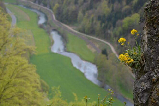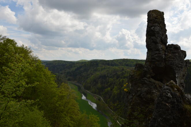 Ab der ersten Kehre der Straße "Dooser Berg" von Muggendorf nach Doos beginnt der Waldweg zum "Felsensteig", der schon nach wenigen Metern von diesem Weg linkerhand über Stufen ziemlich steil nach oben führt. Immer dem -teils schmalen- Pfad entlang der Abbruchkante des "Hohlen Bergs" nach oben folgen, vorbei an einigen schönen Punkten mit Tiefblick in´s Wiesenttal, vorbei an einer markanten Felsnadel, immer geradeaus weiter in den Mischwald bis der neue hölzerne Aussichtsturm "Hohes Kreuz" -das Ziel des Felsensteigs- auftaucht.