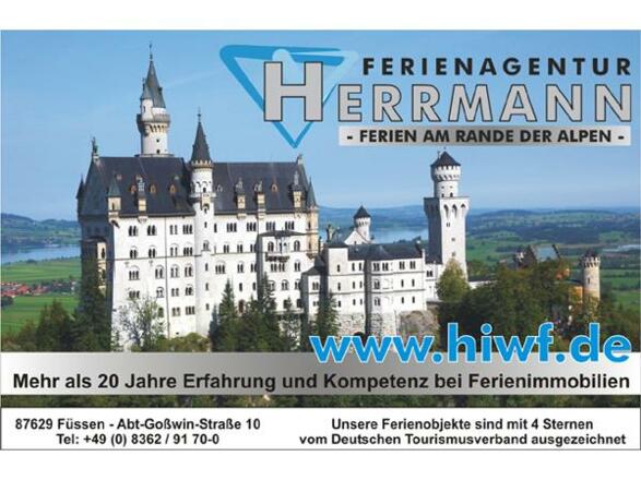 Die 3 Zimmer-Ferienwohnung liegt im Erdgeschoss sowie im Untergeschoss und wurde im April 2017 neu renoviert und modern ausgestattet. Sie bietet Platz für bis zu 4 PersonenDie Ferienwohnung liegt am Ortsrand von Füssen direkt im Hopfener Dreieck. Von hier aus haben Sie keine weiten Wege ob in die Altstadt, Forggensee, Hopfen am See oder Schwangau.Das großzügige Wohn-Esszimmer bietet ausreichend Platz für die ganze Familie und hat einen direkten Zugang zur Sonnenterrasse.Die Wohnung verfügt über zwei Schlafzimmer. Eines im Erdgeschoss, das andere im Untergeschoss. Beide sind jeweils mit einem Doppelbett und Kleiderschrank ausgestattet.SonstigesInkl. Heizung, Tiefgarage;