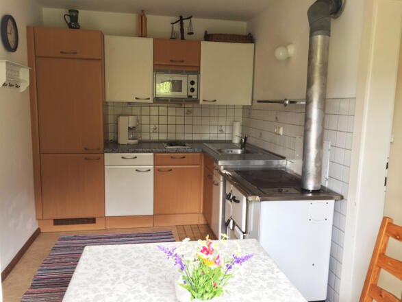 eine vollständig eingerichtete Küche mit gemütlichem Holzofen für kühlere Tage
