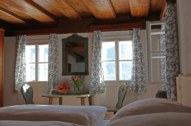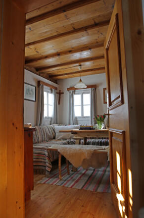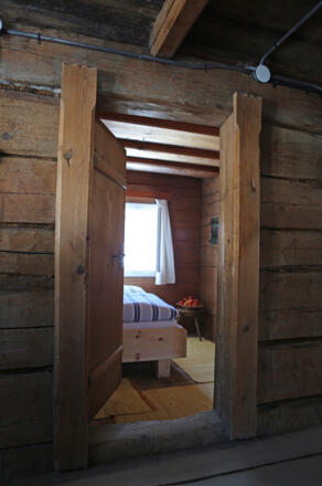 Im Obergeschoß erinnern original erhaltene Wände aus Holz, Tramdecken, Böden und Türen an das Leben von damals.
