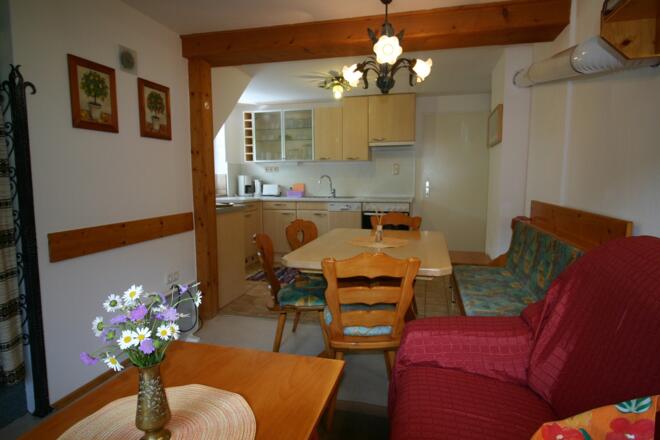 Unser Ferienhaus hat eine Wohnküche mit Kabel-TV, die Küche ist komplett ausgestattet. Im ersten Stock befinden sich die zwei Schlafzimmer, ein 2-Bettzimmer und ein 3-Bettzimmer, weiters befindet sich hier das Badezimmer mit Dusche und WC.