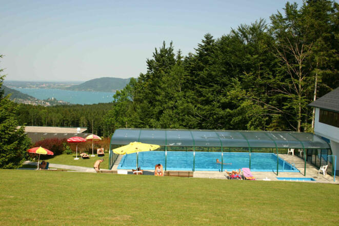 * Geheiztes Schwimmbad mit Panoramadach und Liegewiese
