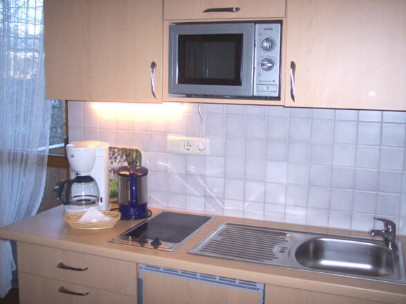 - Komplett inventarisierte Kleinküche mit Spüle, Kühlschrank, Kaffeemaschine und Wasserkocher