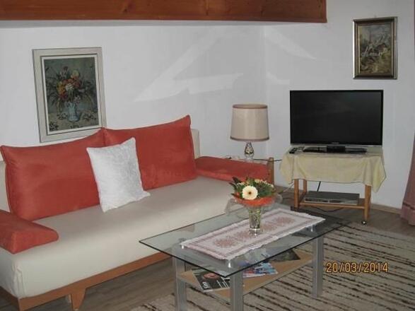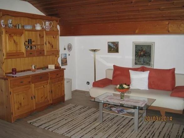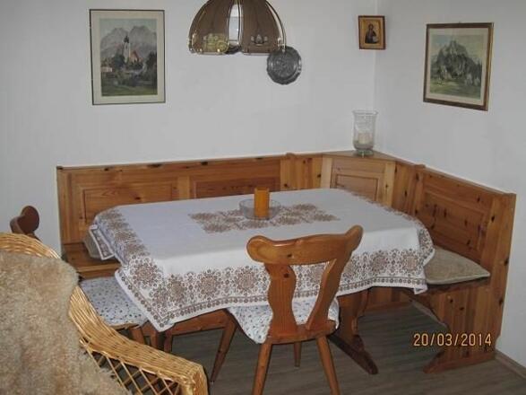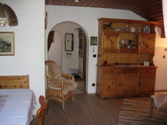 Unsere Ferienwohnung, im 2. Obergeschoß, (49 qm) mit Blick vom Balkon auf die Zugspitze, liegt in ruhiger, zentraler Lage und ist komfortabel, in ländlichem Stil, gemütlich, eingerichtet. Sie hat ein geräumiges Wohnzimmer mit großem Eßtisch und Eckbank , Sitzecke mit Couch, Sat Flachbild TV, DVD Player, Radio, ein separates Schlafzimmer für 2 Personen, Badezimmer mit Duschwand im Bad und WC. Die kleine Küche ist ausgestattet mit sämtlichen nötigen Kleingeräten, wie 2 Kochplatten, Filter- u. Kapselkaffeemaschine, Mikrowelle, kleiner Backofen, Kühlschrank und ausreichend Geschirr. Bett-, Tischwäsche, Hand- und Badetücher stehen in genügender Menge zur Verfügung.