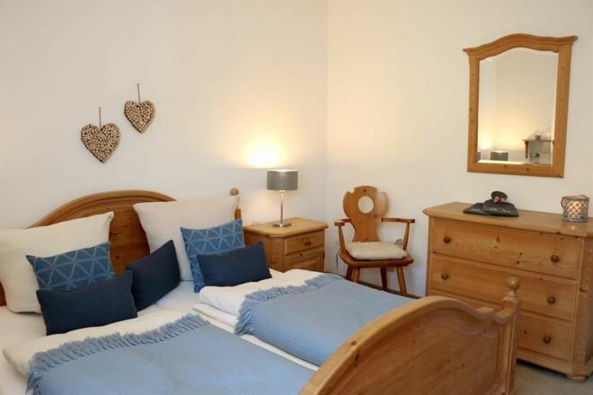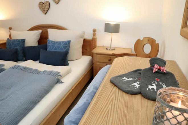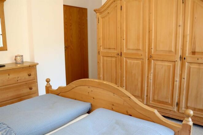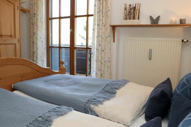 Im gemütlichen Doppelbett werden Sie bestimmt angenehm schlafen, sollte es mal kühler werden, stehen ihnen eine Kuscheldecke oder Wärmflaschen bereit - hier wurde an alles gedacht. Ihre Kleidung können Sie bequem im Kleiderschrank verstauen. Vom Schlafzimmer aus haben Sie Zutritt zu dem großen Balkon, von welchem aus Sie auf den kleinen Teich am Kurpark blicken so wie auf die umliegenden Berge.