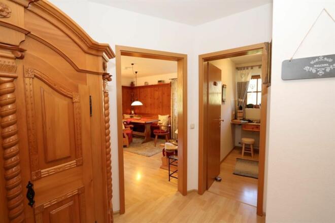 Der rundum laufende Balkon ist auch vom Wohnzimmer aus zugänglich und eröffnet im Sommer einen wundervollen Blick auf den Kirschbaum im Garten, so wie auf die Berge !
