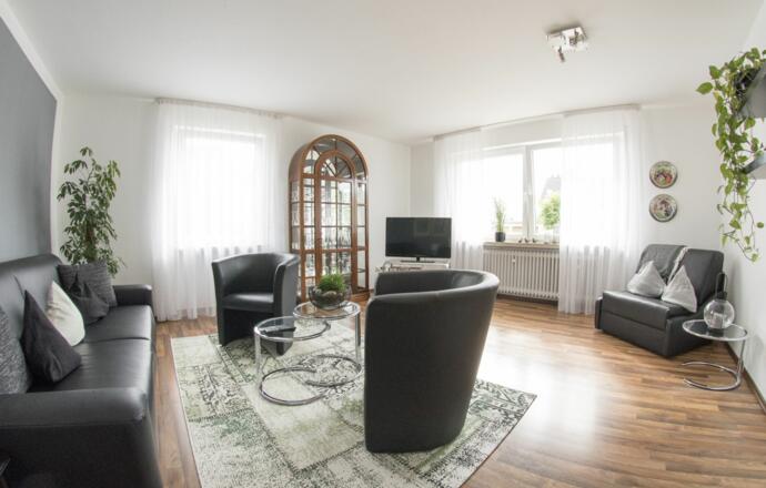 Geschmacksvolle, modern eingerichtete 90 qm große Wohnung in ruhiger Hanglage nahe Waldrand mit seperatem ebenerdigem Eingang, Terrasse mir Mainblick und Weinberge. Komplette Küchenausstattung: Spülmaschine, Mikrowelle, Carenkochfeld mit Backofen, u.v.m. Kabel TV, Radio, Telefon, Kinderbett, Fahrradverleich und komplette Wäscheausstattung vorhanden. Allergiker gerecht. Stadtbus, wander- und Radwege ca. 5 Minuten entfernt. Auf Wunsch reichhaltiges Frühstück. Familien (Kinderermäßigung), Rad- und Motorradfahrer sind herzlich willkommen, auch für eine Nacht. Wir freuen uns auf Sie.