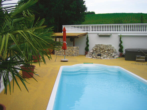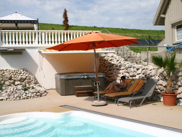 Unsere Nichtraucher-Fewo liegt im EG eines App.-Hauses am Dorfrand umringt von Wiesen in sehr ruhiger und erholsamer Lage auf eine 1700 m² gr. Grundstück. Die Wohnung hat 50 m², 1 sep. Schlafraum, Wohnzi., SAT-TV, Radio, Telefon, W-LAN, CD-Player, Fax, Küche, E-Herd, Essecke, Kaffeemaschine, Kühlschrank, Toaster, Dusche, Badewanne, WC, Waschmaschine, Fußbodenheizung, überdachte Terrasse, Außensitzplatz, Gartenmöbel, Grill, Swimmingpool beheizt, Pkw-Stellplatz. Shuffleboard und Elektronik-Dart, Getränkeservice