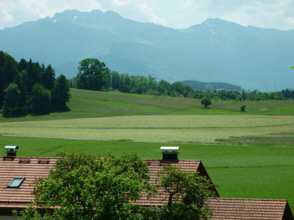 Neue gemütliche und großräumige 80 qm Ferienwohnung im zweiten Obergeschoß. 2 getrennte Schlafzimmer (Eltern und Kinder), große Wohnküche mit voll ausgestatteter Küchenzeile (Geschirrspülmaschine). SAT/TV, Bad/Dusche/WC, Süd- und Ostbalkon mit Panorama-Bergblick, Grillmöglichkeit am Haus, Liegewiese, Pkw-Stellplatz.