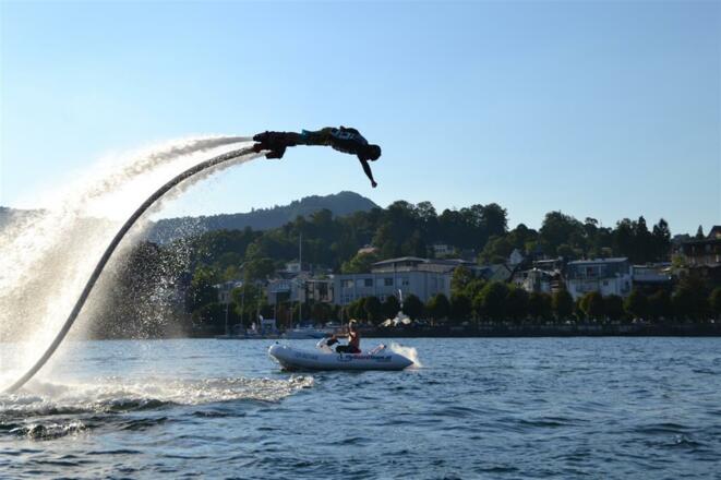 Das Flyboard Ein Flyboard ist ein Wassersportgerät, das durch den Wasserstrahl-Rückstoß eines Jetbootes angetrieben wird und dem Benutzer eine Fortbewegung unter Wasser und in der Luft ermöglicht. Mit dem Flyboard kann man bis zu 9 Meter über der Wasseroberfläche schweben. Das Hoverboard Surfen ist schon langweilig? Dann fügen Sie doch einfach eine 3. Dimension hinzu und surfen durch die Luft! In bis zu 5 m Höhe und mit 25 km/h. Lernen Sie wilde Freestyle Tricks oder genießen Sie einfach das Luftsurfen. Ein atemberaubendes Erlebnis. Ein muss für alle Surfer Kiter und Boarder.