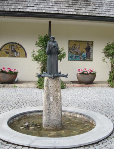Der kleine Franziskusbrunnen steht direkt vor der katholischen Pfarrkirche St. Nikolaus von der Flüe in Bayerisch Gmain.