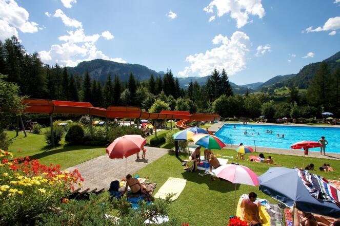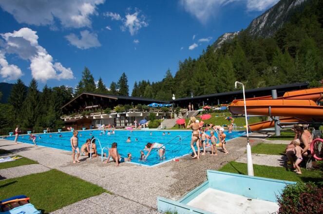 Inmitten von Wald und Fels erwartet Euch ein umweltfreundliches, gas- und solarbeheiztes Freibad, von dem Euch hoch über der Talsohle einen herrlichen Ausblick auf die umgebenden Berge und den freundlichen Ort Unken genießen.