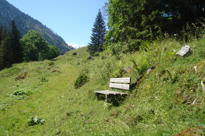 Bei der Embachkapelle nach rechts über die Fuscher Ache, am Wölflerbauer vorbei, leicht ansteigend durch lichte Erlenbestände und über Wiesen und Weiden führt der Weg Richtung Süden.