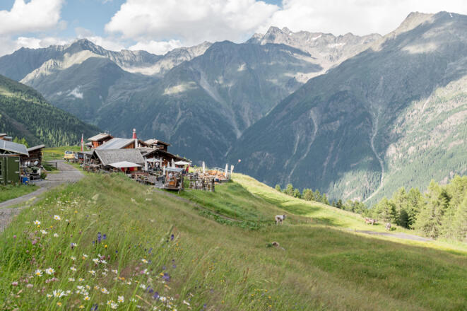Variante 2: gemütlich über den Höhenweg von Hochsölden zur Gampe Thaya. Gehzeit ca. 30 Minuten