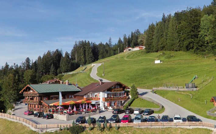 Ruhige Lage, herrlicher Blick auf das Berchtesgadener Tal. Sonnenterrasse, gut bürgerliche Küche. Kinderspielplatz und Sommerrodelbahn für die kleinen Gäste. Auch Ferienwohungen im Haus.