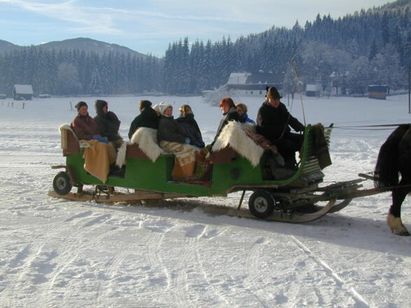 von Rußbach: Bus Richtung Gosau, bei der Endstation "Gosau Abzweigung Pass Gschütt" umsteigen in den Bus Richtung Gosausee, bei der Haltestelle "Hintertal b. Gosau Schmiedweg" aussteigen. Der Gasthof befindet sich auf der rechten Seite.