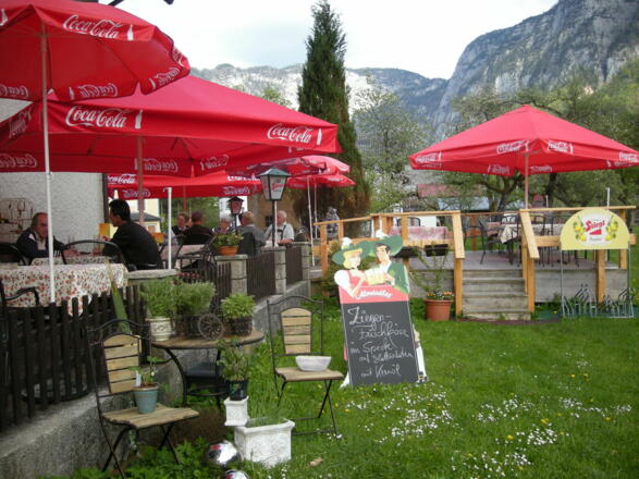 Ein schöner Gastgarten mit Kinderspielplatz, der Blick auf den Krippenstein und seinen 5Fingern, höll'isch gut essen und trinken, durchatmen und geniesen; denn wie Winston Churchill schon sagte: