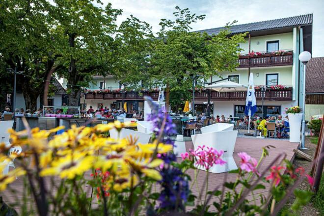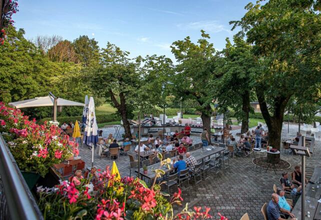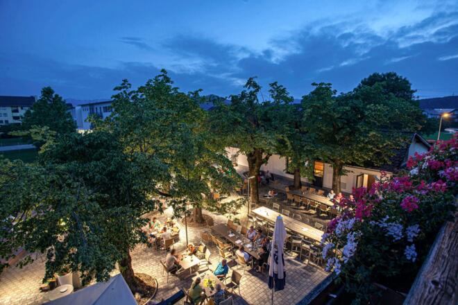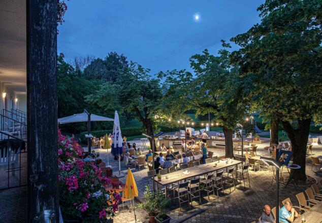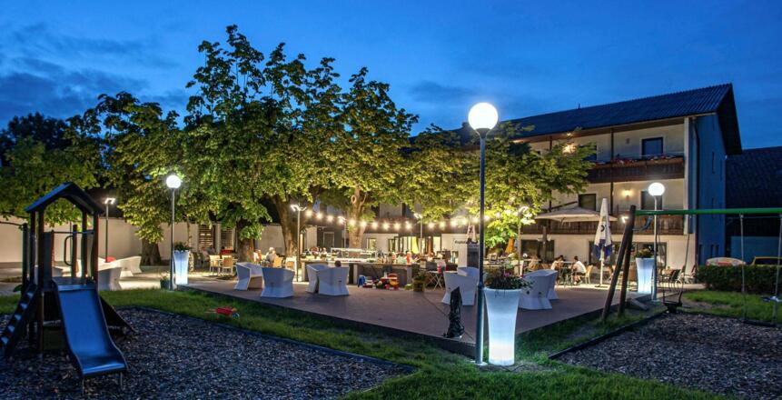 Schöner schattiger Gastgarten mit Kinderspielplatz. Gruppenermäßigung. 3 vollautomatische Kegelbahnen.