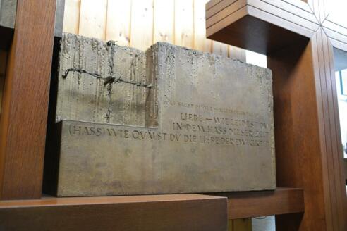 Der Schweizer Albert Wider gestaltete die Gedächtnisstätte vom seligen Carl Lampert. Der Abschiedsbrief an seinen Bruder Julius und der abgedruckte Sinnspruch erinnern an sein Leid: „Liebe – wie leidest du in dem Hass dieser Zeit, Hass – wie quälst du die Liebe der Ewigkeit.“