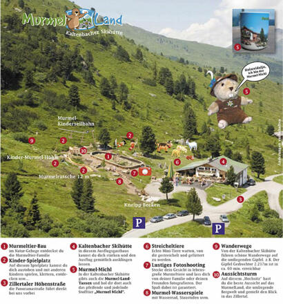 Abstieg: Entweder direkt nach Nordosten auf bez. Steig (Alpengarten) zurück zur Skihütte; oder vom Gipfel wieder kurz südwärts hinunter und über Skigelände nach Südosten absteigen zur malerischen alten Mizunalm, 1870 m. Von hier dem Fahrweg folgend kurz zur Zillertaler Höhenstraße und auf ihr nach Norden zurück zur Liftstation und zur Skihütte.
