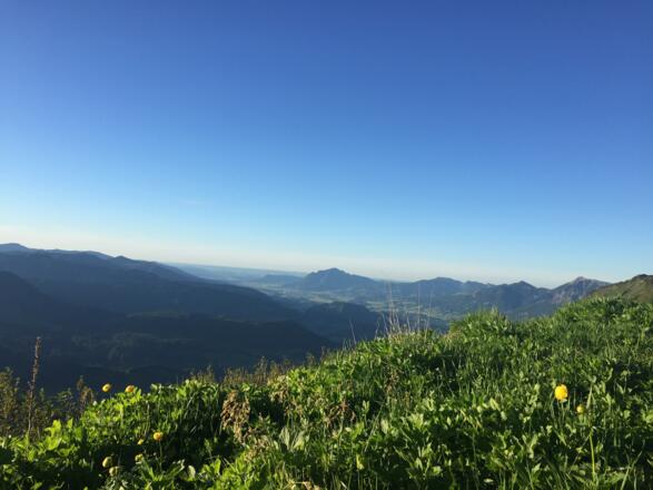 Verteilt auf nur 3 km warten hier knackige 800 Höhenmeter. Gleich ab unten geht es steil nach oben und durch den Wald über einen Wurzelweg bis nach oben auf die Gehrenspitze, die einen wunderschönen Blick ins Kleinwalsertal und ins benachbarte Allgäu bietet.