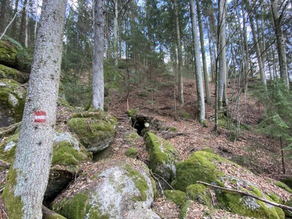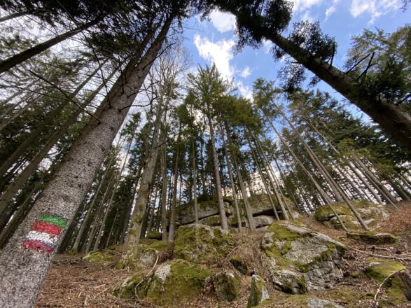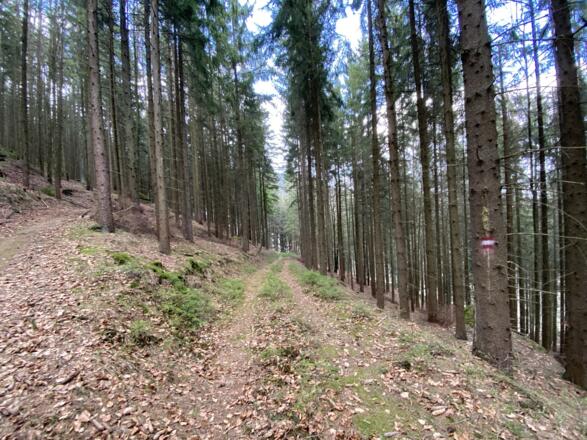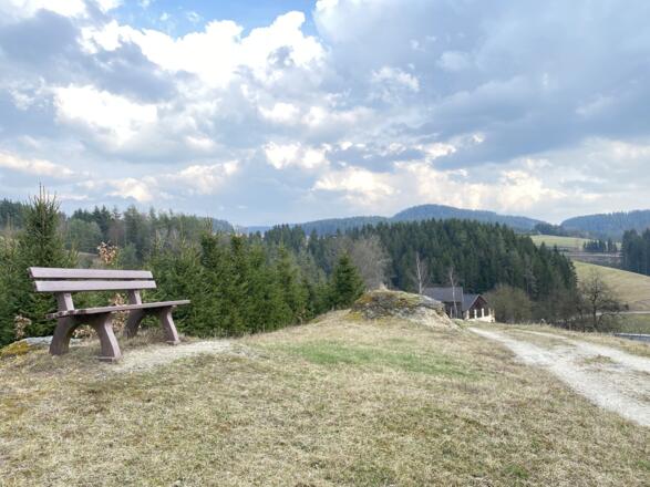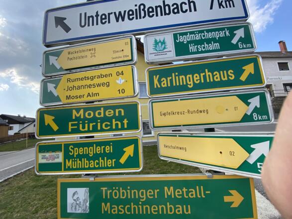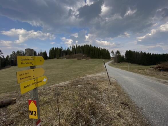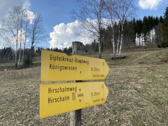 Vom Marktplatz starten und an der Kirche und Raiffeisenbank vorbei, hinauf Richtung Schulzentrum. Nach dem Karlingerhaus nach einer starken Links- und einer starken Rechtskurve rechts auf den Waldweg einbiegen. Knappe 400 Hm geht es auf einem sehr schönen Waldwanderweg hinauf zum Gipfelkreuz. Von dort der Beschilderung weiter folgen, an der Johannesweghütte vorbei und über den Johannesweg zurück bis Königswiesen.
