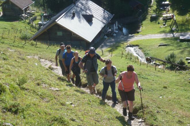 Vom Hotel Alpendorf fahren wir ca. 20 Minuten in Richtung Grossarl zum Parkplatz Himmelsknoten. Von dort geht es ca. 200 Höhenmeter den Forstweg Nr. 31 bis zur Igltalalm entlang. Hier besteht die Möglichkeit noch einmal die Trinkflaschen zu füllen. Danach gehen wir den markierten Weg bis zur Senke zwischen Schober und Höllwand auf ca. 1900m. Mit großer Wahrscheinlichkeit können wir hier Gämse und Murmeltiere in den steilen Hängen beobachten. Von der Senke geht es links weiter in Richtung Heukareck. Hier geht es ein kleines Stück bergab, bevor wir den letzten steileren Weg bezwingen. Kurz vor dem Heukareck biegen wir noch für einen kurzen Ausblick zum Tennköpfl ab. Von dort brauchen wir noch ca. 20 Minuten auf den Gipfel. Oben angekommen genießen wir den Ausblick von 2100m über die umliegenden Täler, Berge und Flüsse. Nach einem Gipfelschnapserl geht es den gleichen Weg zurück bis zur Igltalalm. Hier befreien wir uns von Schuhen und Socken und stecken unsere erschöpften Füsse in den kalten Bergbach. Danach stärken wir uns noch mit selbstgemachten Köstlichkeiten der Alm und gehen danach den Forstweg zurück um Parkplatz.