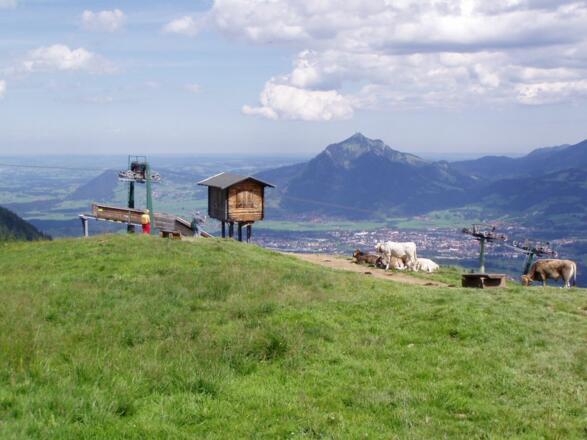 Alternativ können Sie vom Ochsenkopf zurück zum Berghaus Schwaben wandern und von dort aus, dem geteerten Alpweg zurück zur Bergstation folgen.