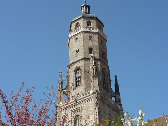 Vom fast 90 Meter hohen „Daniel“, dem Turm der Nördlinger St. Georgskirche, bietet sich ein wunderbarer Ausblick über die historische Stadt Nördlingen und das Ries. Lediglich 350 Stufen gilt es