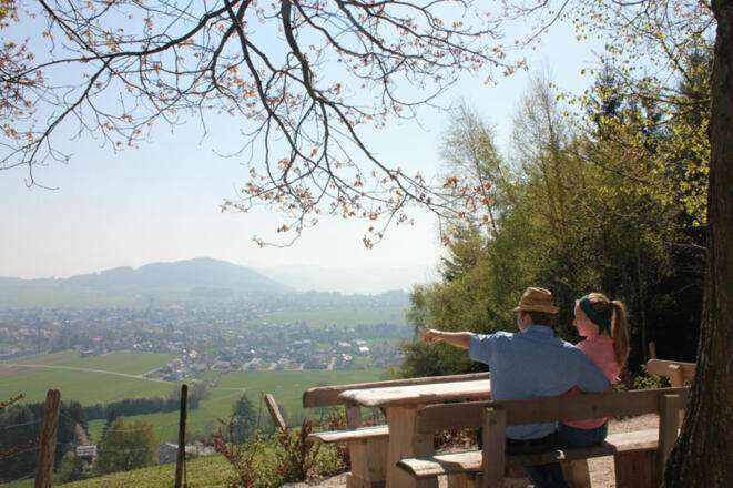 Der Glücksplatz am Koglberg mit Schatten spendenden Bäumen und Blick auf die drei Attergaugemeinden bis hin zum Attersee, dem Höllengebirge und Schafberg. ist der Mundartdichterin Anna Vogl gewidmet.