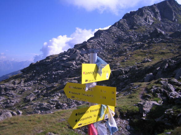 Über Gamslahnerspitze 2.681m, Kreuzjöchl 2.575m, Kreuzspitze 2.746m, Rosenjoch 2.796m, die Grünbergspitze 2.790, zur Grafmartspitze 2.720m. Diese erste Hälfte ist teilweise kein Steig, sondern Blockwerk - aber alles gut markiert!