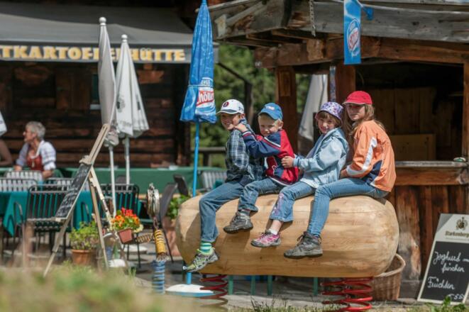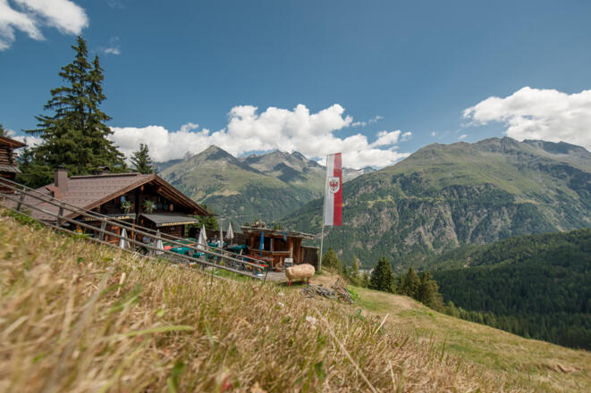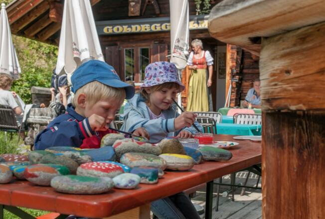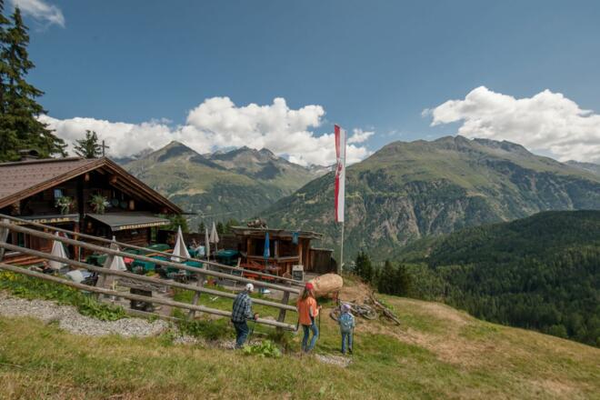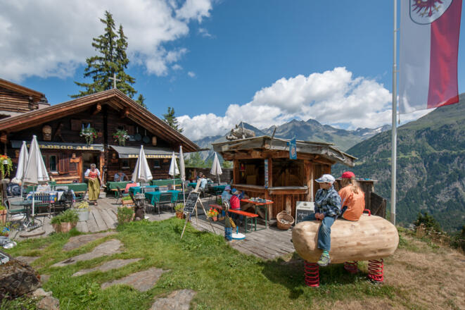 Die Goldegg Alm auf 1.903 m bietet ein gemütlich-uriges Ambiente. Auf der sonnigen Terrasse oder in der warmen Stube fühlt man sich in den Bergen zu Hause. Die ganztägig warme Küche serviert Tiroler Köstlichkeiten und ist bekannt für ihre Hausspezialität "Ötztaler Bratkartoffel". Dazu passend wird das ALMZEIT Thema "Kartoffelzeit" aufgegriffen. Für jede Menge Spaß ist gesorgt, denn gibt es für die Kids eine eigene Kinderspielhütte sowie eine große, federnde Kartoffel.