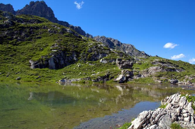 Weiter gehts auf der rechten Seite vom See in Richtung Heinzensprossenrücken wo es etwas abenteuerlich wird. Auf diesem Abschnitt ist Trittsicherheit wichtig. Man wird durch ein tolles Bergpanorama belohnt und kann nochmal einen Blick zurück zum Roßkarsee werfen bevor es am Abzweig VOR dem Hirschleskopf zum Schafkarsee geht. Der Schafkarsee ist zwar weniger imposant wie der Roßkarsee, ist aber von tollen zackigen Felsen umgeben.