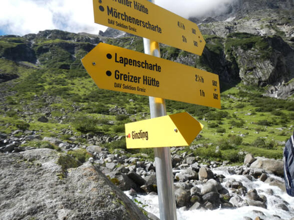 Von Ginzling auf dem Teersträßchen ins Floitental zur Tristenbachalm. Auf dem Wirtschaftsweg talein zur Talstation der Materialseilbahn (bis hier Wandertaxi). Weiter auf AV-Steig Nr. 521 zur Brücke über den Floitenbach, dann Weg Nr. 502 hinauf zur Greizer Hütte.