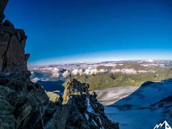 Tour: Wir steigen westlich vom Grat über die sogenannte Petersstiege (UIAA I-II) weiter bis zum Frühstücksplatz (3.550 m). Von der Tafel leicht links und eine Verschneidung III hinauf. Den nächsten Turm (Kanzel) umklettert man östlich. Von hier geht es in anhaltender Schwierigkeit, oft sehr ausgesetzt, meist westlich des Grates weiter. Es folgt eine Platte die man über einen Riss erreicht III+. Nach einer weiteren Seillänge folgt die Schlüsselstelle III+ A0, die mit einem Hanfseil und Trittstiften begehbar wird. Nun etwas leichter bis zum höchsten Punkt von Österreich.