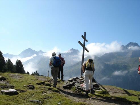 Almkreuz am Waldrand mit schönem Blick auf das Wander- und Schigebiet Hochötz