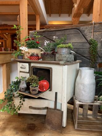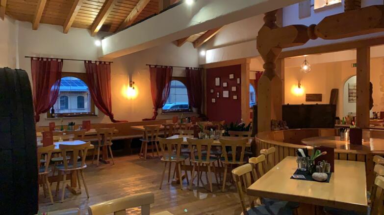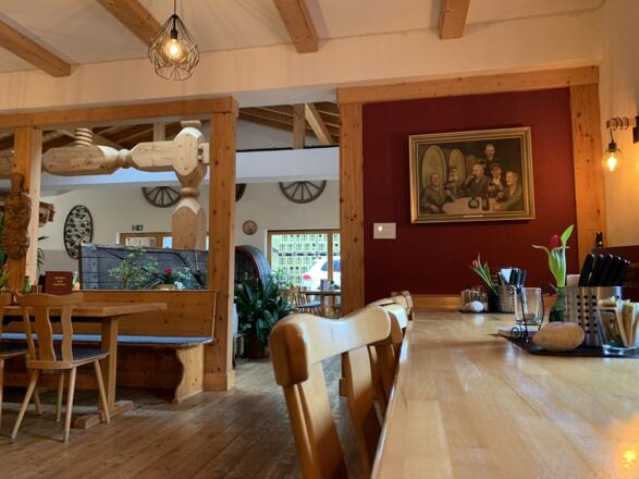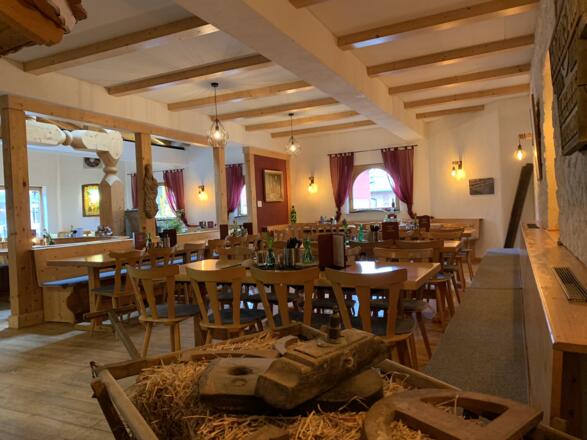 Die Gasträume sind urig gestaltet, in der Mitte des Raumes wurde eine Weinpresse mit Tisch intigriert.
