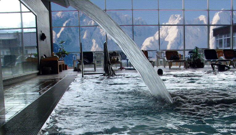 Erlebe Wasserspaß im Hallenbad Gosau im Dachstein Salzkammergut mit einem eindrucksvollen Panoramablick auf den Gosaukamm.