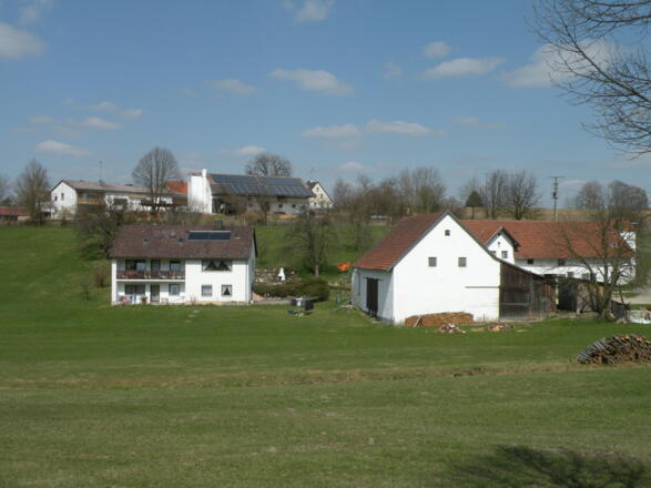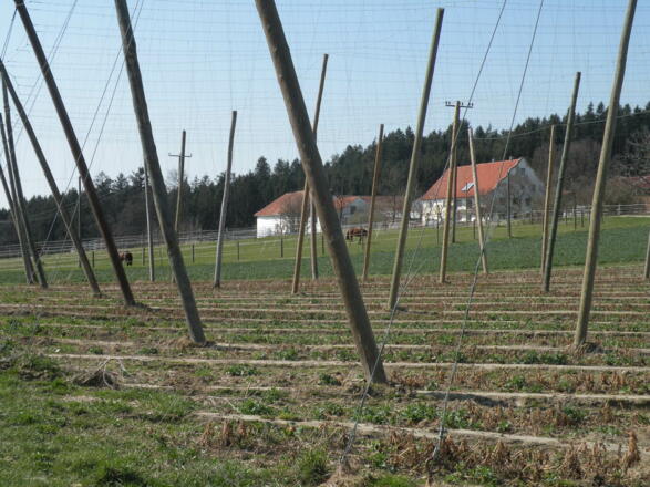 Am Ortsende von Au verlassen wir diese recht befahrene Route, wenn wir auf Höhe eines Reitturniergeländes nach rechts in Richtung Osseltshausen abbiegen. Nun radeln wir durch ein kleines Tal – beiderseits stehen die Hopfengärten und wenn’s grad Sommer ist, dann radelt man hier wie zwischen grünen Wänden. Das größte Hopfenanbaugebiet der Welt befindet sich hier und das Grüne Gold wird auch in alle Welt exportiert. Wir passieren einen Einödhof, den Kleintonhof; anschließend steigt die Straße leicht an bis Osseltshausen, wo wir links in die Talstraße einbiegen und - kaum drin - auch schon wieder aus dem Ort hinaus fahren. Über Neuhub führt uns eine schmale Straße nach Holzhof.