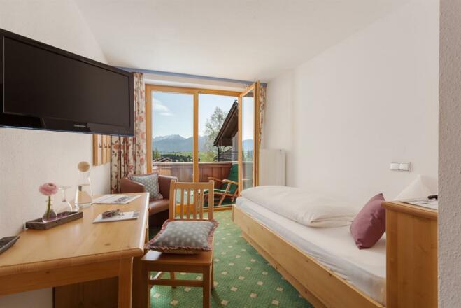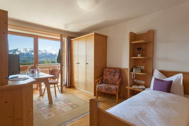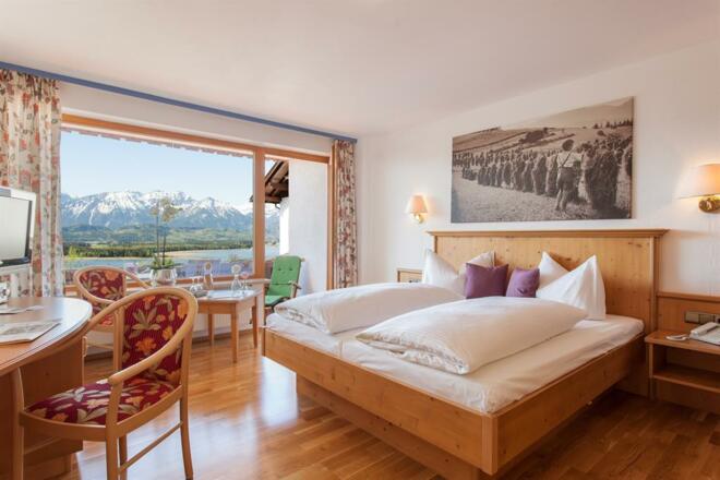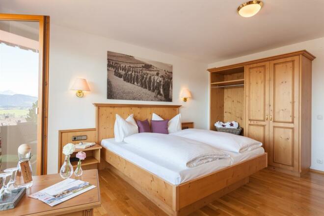 Bereits in der 4. Generation freuen wir uns, Sie in unserem schönen Hotel mitten im Allgäu, oberhalb vom Hopfensee mit Blick auf die Allgäuer Alpen herzlich begrüßen zu dürfen.Einzigartig...Traumhaft ist die Ruhe und der Blick auf die Königsschlösser, den Hopfensee und das Alpenpanorama. Wir bieten Hotelzimmer und Appartements für 1-6 Pers..Alles kann, nichts muss...Wir bieten Ihnen umfangreiche kulinarische Verpflegung an– dabei stammen die verwendeten Fleisch-/Wurstwaren vorwiegend aus eigener Herstellung und eigener Jagd. Ein tolles Frühstücksbuffet mit regionalen Spezialitäten und frisch gepressten Säfte garantieren einen tollen Start in den Tag! Abends verwöhnen Sie unsere Köche mit täglich wechselnden 4-Gänge-Menüs oder Themenbuffets.Wellness und Kur – pur...In unserer Wellnessabteilung verwöhnen wir Sie mit einem umfangreichen klassischen Therapiangebot, kosmetischen Anwendungen und ayurvedischen & fernöstlichen Massagen . Die Benutzung von unserem Schwimmbad ( 8x14m)SonstigesGerne benutzen Sie unser Schwimmbad mit Saunabereich und Kneipptretbecken kostenfrei. Vor Ort können Sie die Halbpension hinzu buchen.