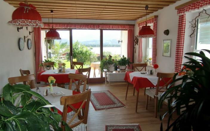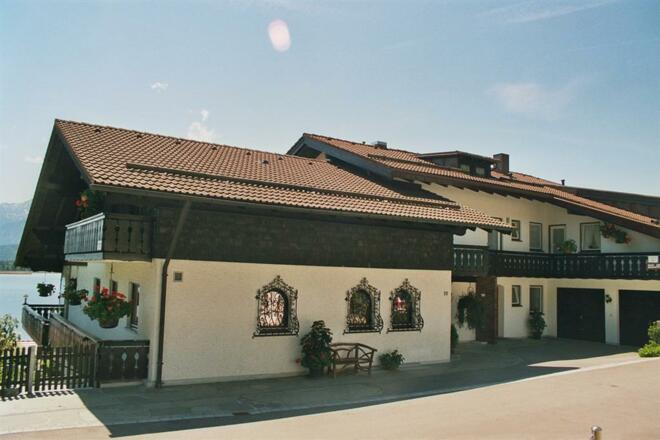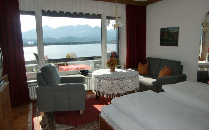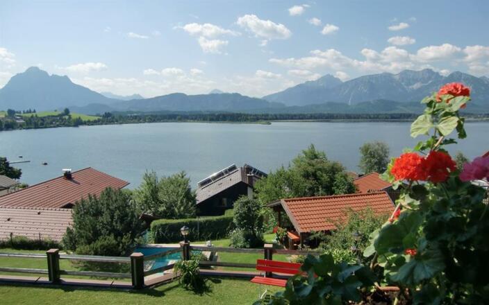 Alle Ferienwohnungen und Doppelzimmer sind mit Panoramablick und Südbalkon/Südterrasse. Bei allen FW ist der Wohnbereich mit Küche und das Schlafzimmer getrennt. Jede Ferienwohnung ist individuell und behaglich eingerichtet.Für die Zimmer steht eine Teeküche zur Verfügung (ohne Frühstück). Eine Bäckerei ist in der Nähe.Spitzenlage, schönste Südhanglage mit See-, Berg- und Schlossblick, 150 m zum Hopfensee.SonstigesParkplatz am Haus, Handtücher, Bettwäsche und Geschirrtücher inklusive. Brötchenservice auf Anfrage. Kein Frühstück - Teeküche mit Kühlschrank, Kaffeemaschine, Wasserkocher usw. vorhanden.