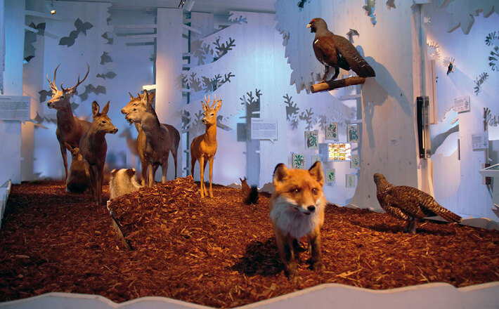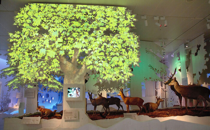 Im Haus der Berge in Berchtesgaden befindet sich in einem großen Raum die Ausstellung "Vertikale Wildnis", in der die Besucher auf einer stetig ansteigenden Wanderung die heimische Natur kennen lernen:
