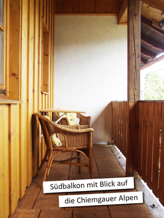 In unserer wunderschönen, hellen und freundlichen Maisonette- (Galerie-) Wohnung sorgt viel Holz für Behaglichkeit und ein angenehmes Wohnklima. Im Wohn-/ Essbereich befinden sich eine gemütliche Couch-Ecke und ein Esstisch mit 4 Stühlen. Auch ein Kachelofen ist vorhanden. Von diesem Zimmer aus gelangt man auch auf den Südbalkon mit Blick auf die Chiemgauer Alpen. Vom Wohnzimmer aus gelangt man über eine offene Holztreppe auf die Galerie, wo sich der Schlafbereich, ein begehbarer Kleiderschrank und das Badezimmer mit WC und Dusche befinden. Für Ihr Fahrzeug gibt es einen großen Carport, zwei Fahrräder stehen Ihnen kostenlos zur Verfügung. Haustiere sind auf Anfrage gerne Willkommen, hierfür berechnen wir einen Aufschlag von 3,-- Euro pro Übernachtung.