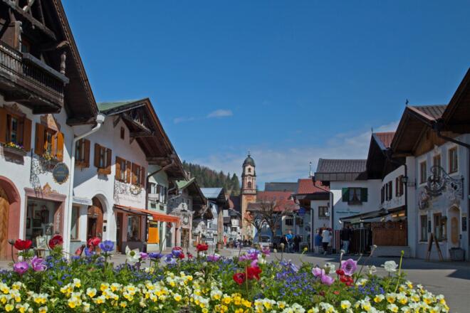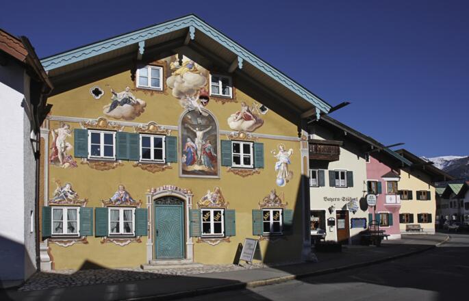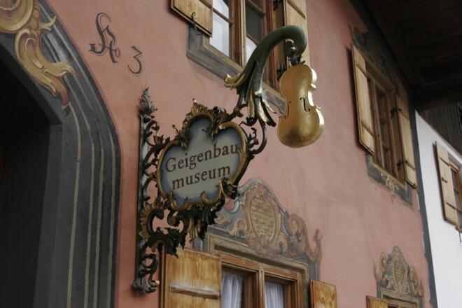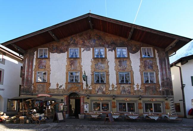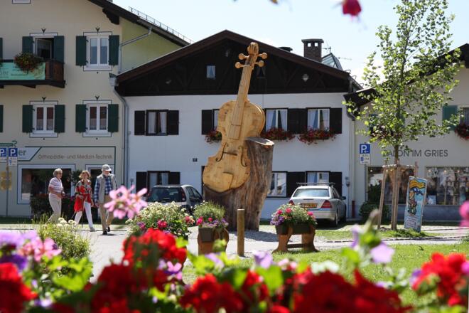 Zurück geht man wieder bis zum Gasthaus Gries und nimmt die rechte Abzweigung an der großen Holzgeige vorbei in die Stainergasse. Die Stainergasse führt direkt in den Obermarkt, der traditionellen Fußgängerzone von Mittenwald. Auch hier findet man einzigartige Lüftlmalereien an den Hausfassaden. Besonders herausstechend ist die Freskenmalerei des Traditionsgasthofes Alpenrose mit der Darstellung der 5 Sinne. Am Ende zweigt man rechts ab in die Hochstraße und spaziert entlang der Bahnhofsstraße wieder zurück zum Ausgangspunkt der Rundtour.