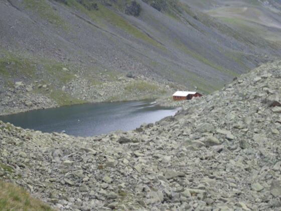 Abstieg zum Depot und Abfahrt des steilen Gipfelhanges bis unter die Lawinenverbauungen. Knapp darunter gleiten wir westwärts, überqueren die beiden Hochalterpisten und versuchen ohne Gegenanstieg unter die Hütte am Gossenköllesee abzufahren. Anfellen.