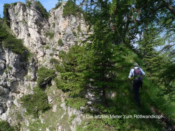 Kurz danach kommen 3 Steinmauern im Bachbett, deren letzte einen kleinen Stausee bildet. Hier sehen wir am gegenüberliegenden Ufer ein steiles mit Geröll gefülltes, ausgetrocknetes Bachbett und darin ca. 100 m über uns einen auffallenden nahezu quaderförmigen Felsen. Dieser ist unser erstes Ziel. Oberhalb des Wasserstaus überschreiten wir den meist flachen Bach ohne Brücke und finden am gegenüberliegenden Ufer einen gut ausgetretenen, aber nicht markierten Pfad, der uns in Aufstiegsrichtung am rechten Rand des ausgetrockneten Bachbettes bis über den quaderförmigen Felsen hinaufführt. Kurz oberhalb überschreiten wir das Bachbett. Im schattigen Wald steigen wir weiter, kommen an einem kleinen Wasserfall, dem Wasserwandl vorbei. Das Gelände wird steiler. Der Baumbestand wird schnell lichter, so dass der Hang einen parkähnlichen Eindruck macht. Die Vegetation ist vielfältig. Nach knapp 2 Std. teilt sich der Weg kurz unter einem Grat. Wir steigen teilweise ausgesetzt in wenigen Minuten nach rechts zum exponiert wirkenden Rötlwandkopf (1379 m) hinauf, wo wir uns die erste Rast verdient haben.