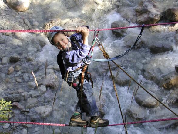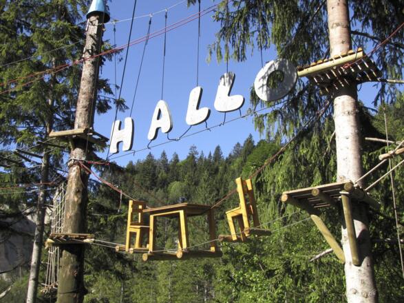 Der Hochseilgarten bietet einen Kletterturm, ein Boulder Tipi und eine Isar-Rutsche.