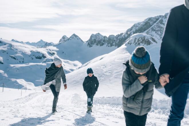 Gutes Schuhwerk (knöchelhoch, Profilsohle), warme Kleidung, Kappe, Handschuhe und Liftticket, Schneeketten für Schuhe