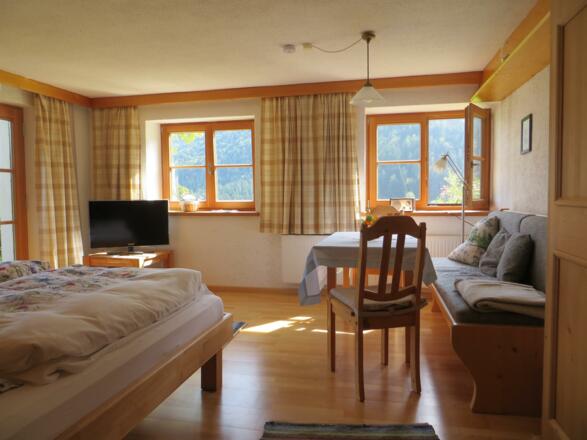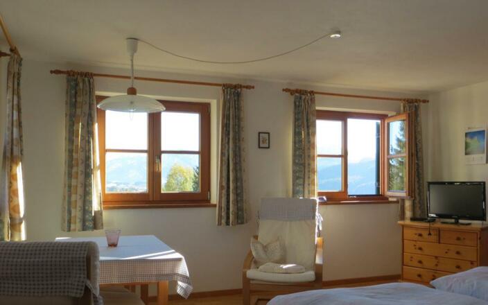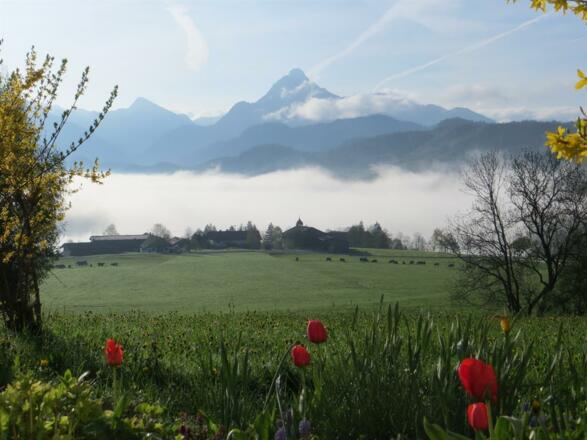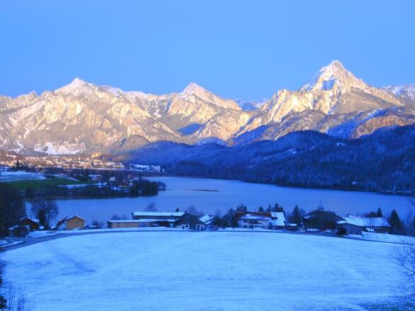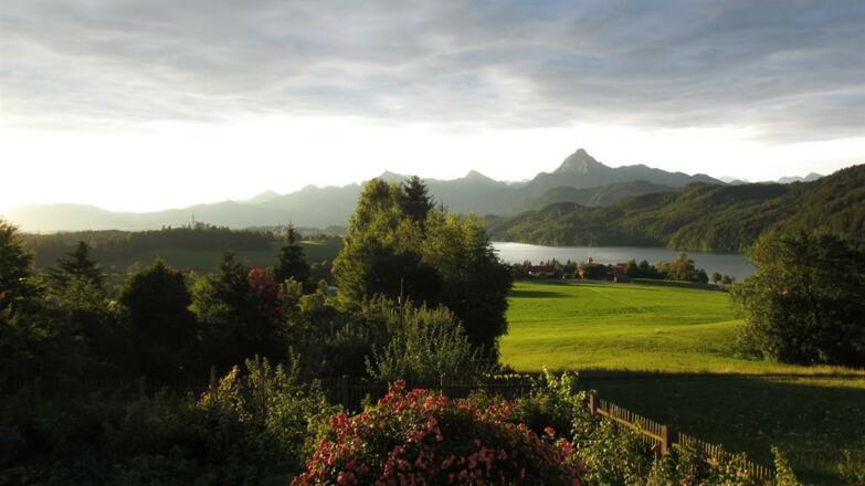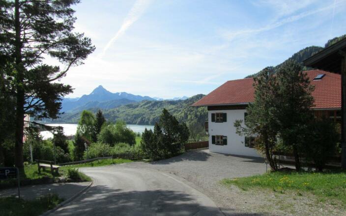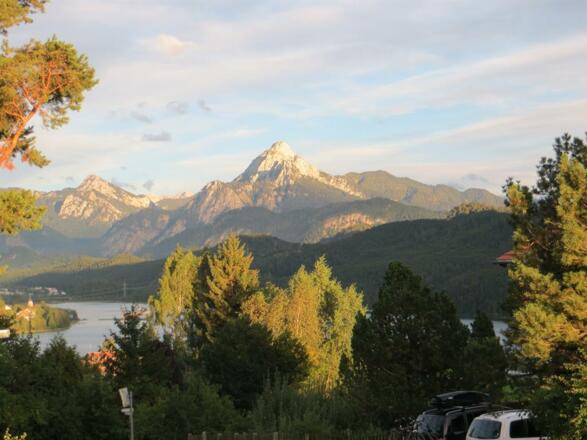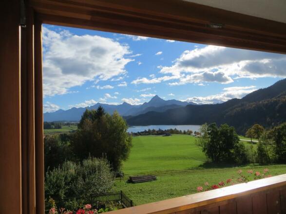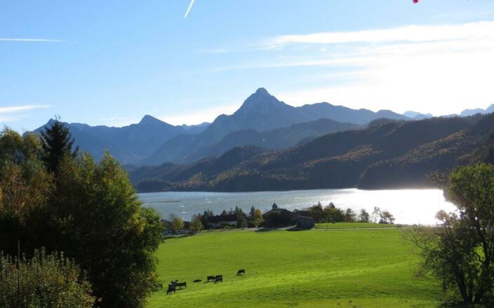 Malerischer Blick auf den Weißensee und auf die Allgäuer Berge von jeder der drei Ferienwohnungen auf unserem Hof Hinteregg. Umgeben von Wiesen oberhalb des Weißensees, 10 Gehminuten zum See, 10 km bis Schloss NeuschwansteinSonstigesParkplatz, Sonnenliegen, Geschirr- und Handtücher, Gitterbett und Kinderhochstuhl inklusive, Unterstellplatz für Fahrräder, WLAN