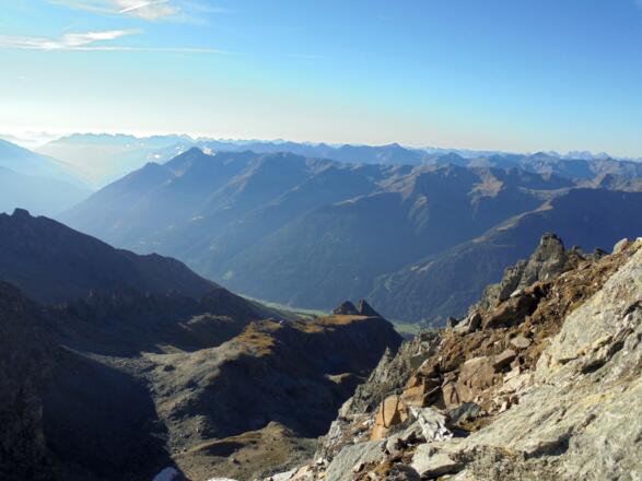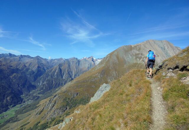 Der Venediger Höhenweg - jetzt als Weg Nr. 923 - führt auf der Südseite des Venedigermassivs westwärts. Erneut ist das Panorama großartig - unser Blick geht jetzt ins Virgen- und ins Timmeltal. Dann trennen wir uns auch vom Höhenweg - dieser führt weiter zur Eisseehütte, während wir in Richtung Prägraten absteigen. Nach dem Wasserfall des Timmelsbaches kann man direkt nach Prägraten absteigen - wir machen noch eine Runde hoch über dem Ort zum Ortsteil Bichl, ehe auch für uns die Tage in den Hohen Tauern zu Ende gehen.